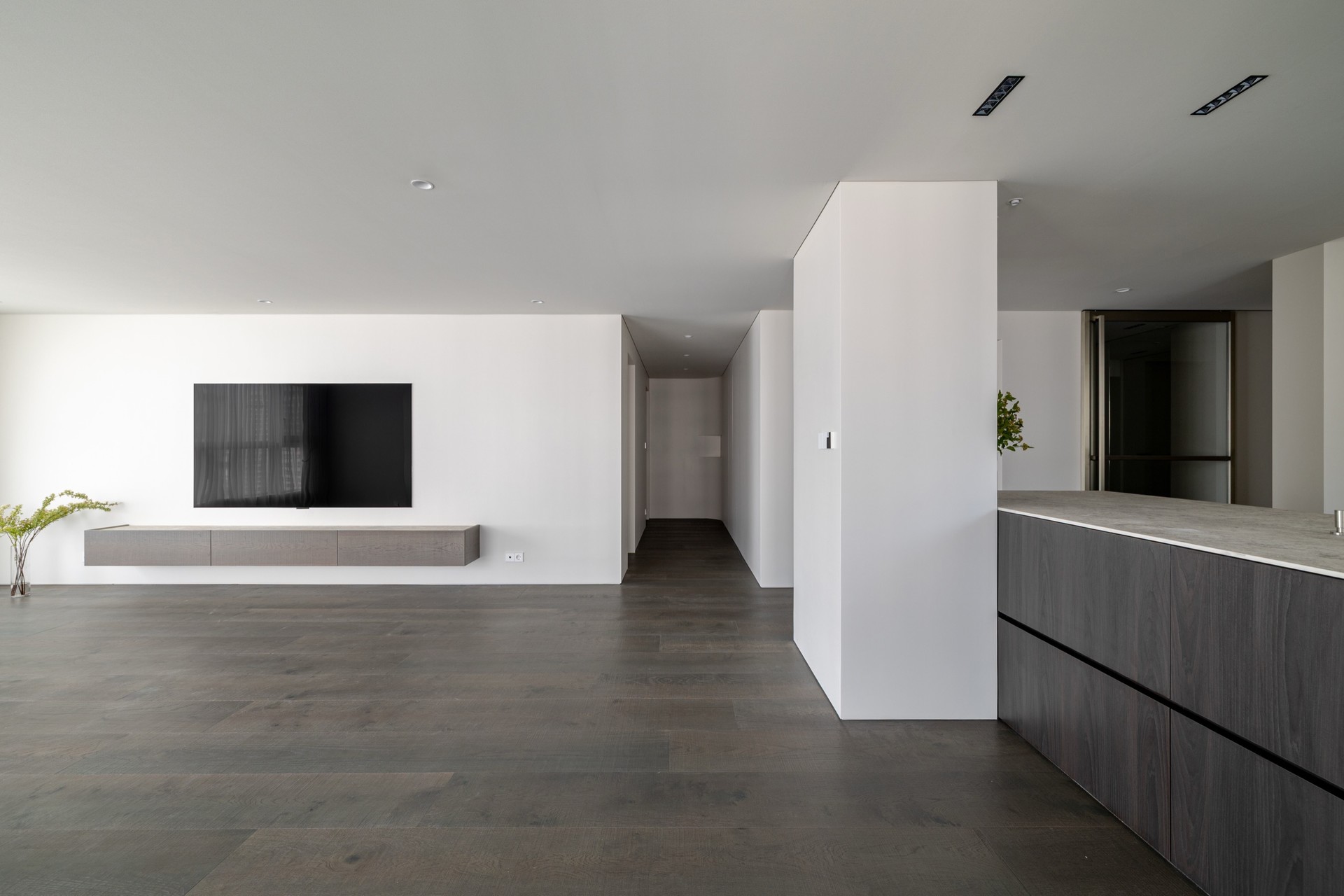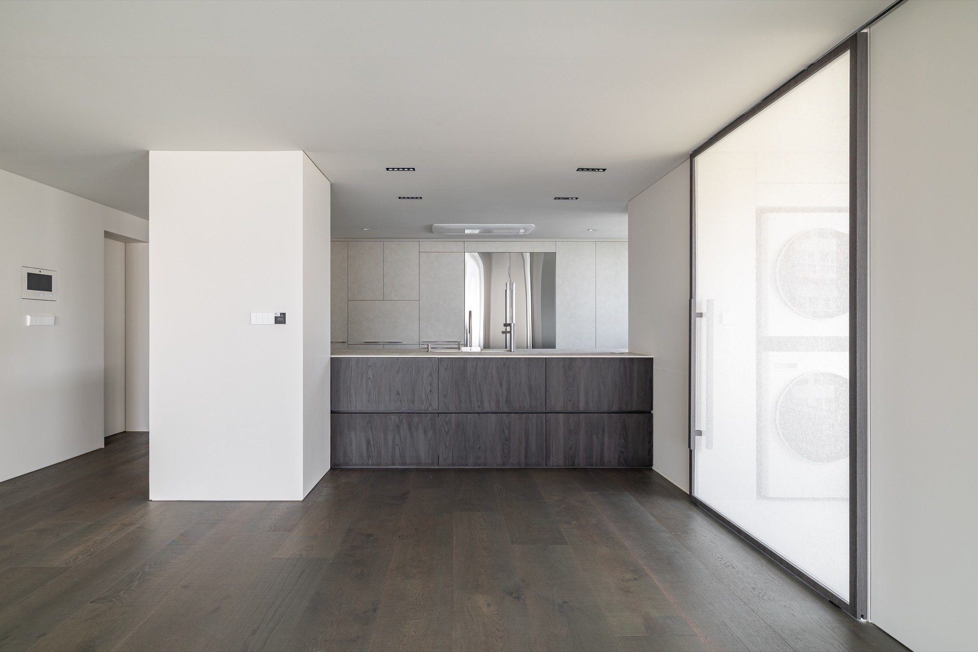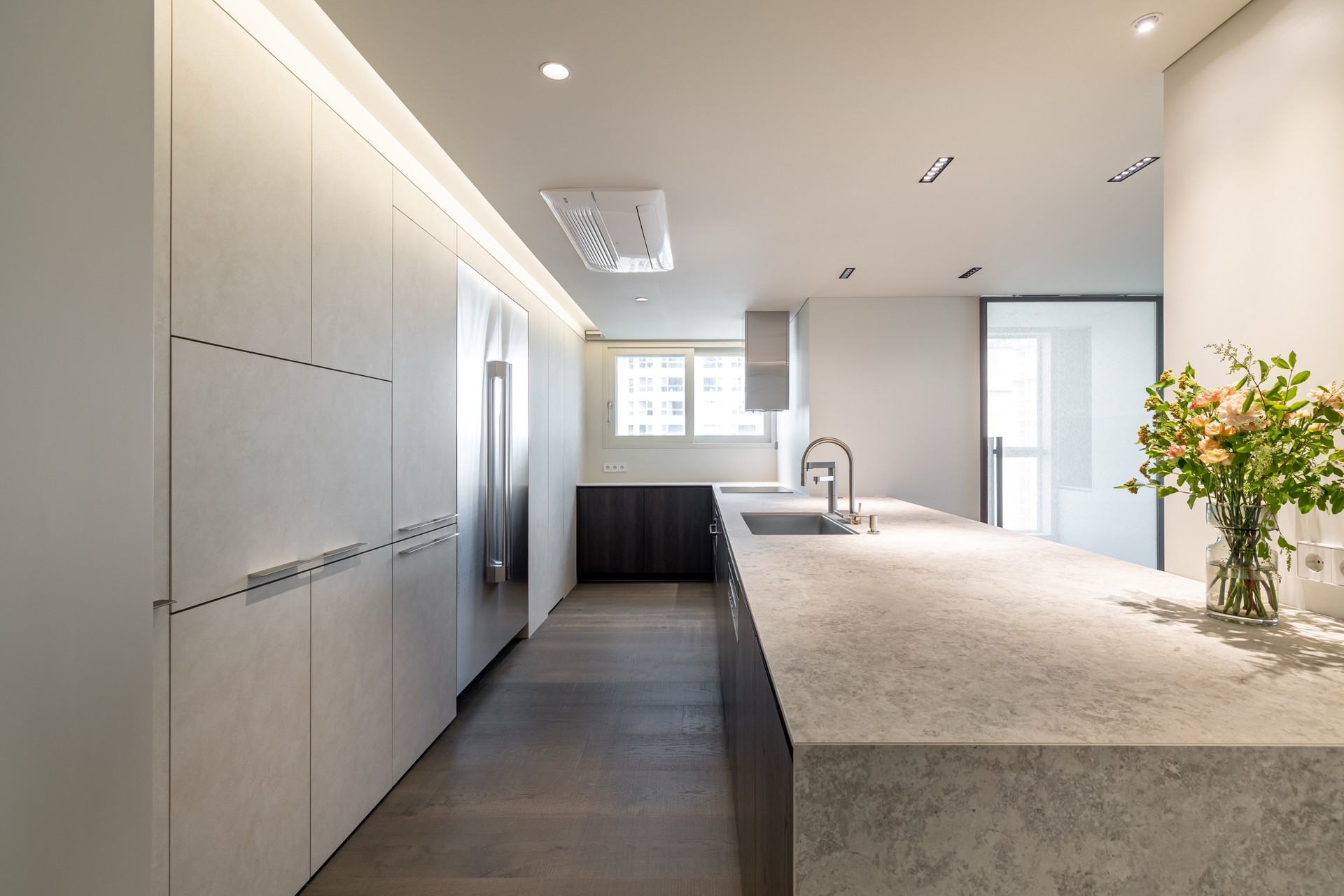 주방과 거실 사이 구조 기둥으로 인해 답답했던 공간을 확장형 구조로 풀어내고, 깨끗하면서 차분한 분위기의 디자인으로 완성했습니다.